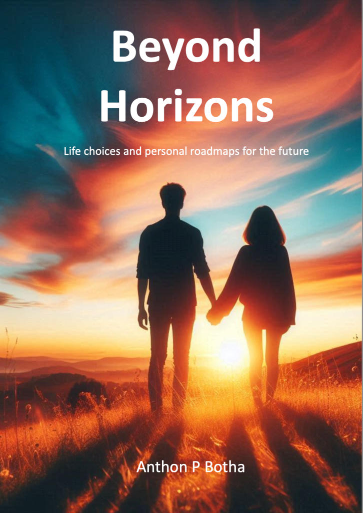 After many years of future thinking support to businesses and organisations, we now present to you our latest book, Beyond Horizons, our approach for assisting you to explore the personal future landscapes for your life and the roadmaps how to get there. This is a self-help book, guiding you through context, content and giving you assignments to plot your own path according to the mind models we present. We are bringing to you thought frameworks supported by examples and guide you to do the mapping of your own future. This takes place at various markers on your life path, normally where you experience inflection points, or major life changes. An inflection point represents a significant shift or turning point in your life path, often leading to a change in direction or trajectory taking you into uncharted territory with new excitement, but also uncertainty. These inflection points can be either positive or negative and are often accompanied by a sense of change, transition, and usually, uncertainty. Life choices must be made at these inflection points, and we assist you to make these decisions against a well thought-through future landscape and life scenarios that will enable you to navigate towards a preferred future and avoid a likely future that you will gravitate to if you do nothing. We invite individuals, couples and families to read this book and work through its examples and make life choices on what to do in your individualised cases. Come and join us on this life changing journey that will provide you with control and certainty to face your tomorrows.