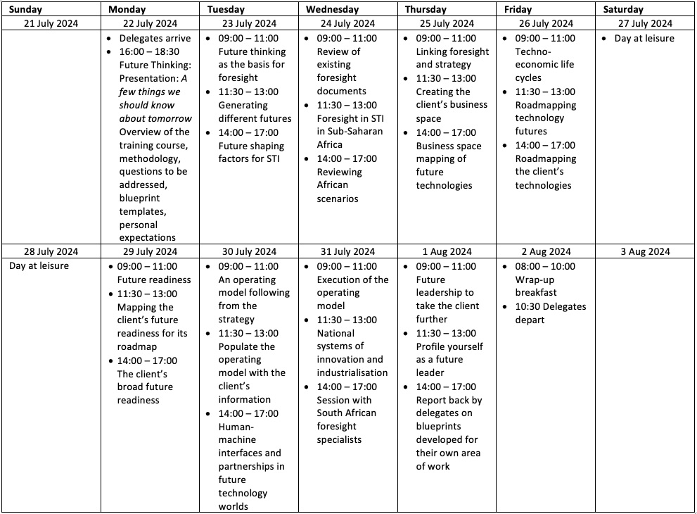 The purpose of this course is to develop and present a customised course for clients in governments to assist them to effectively implement foresight and be able to use technology management tools to analyse and select technologies required to strengthen National Systems of Innovation.